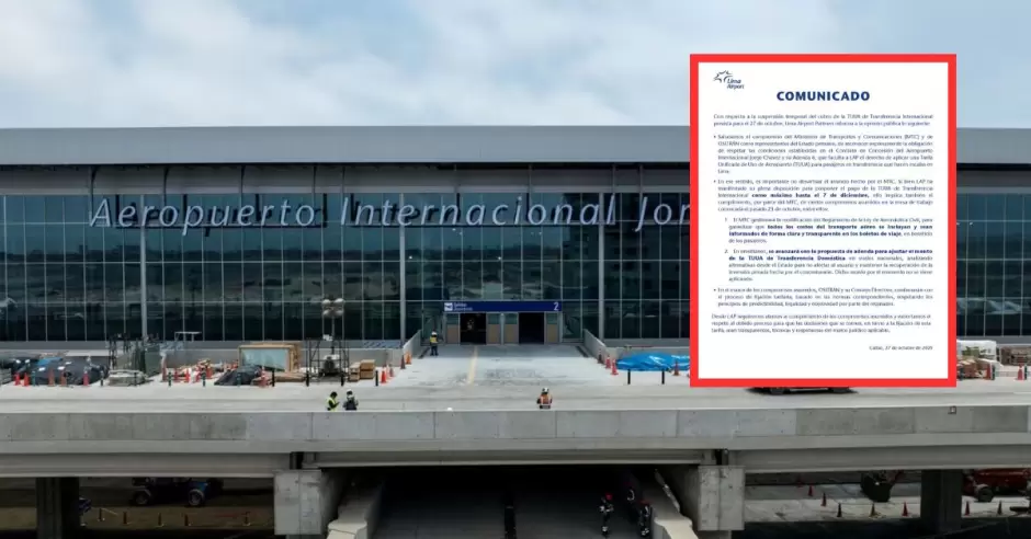 Lima Airport Partners (LAP) indicó que el Ministerio de Transportes y Comunicaciones deberá cumplir los compromisos asumidos en la mesa de trabajo y reafirmaron que tienen la disposición de posponer el pago de la TUUA de Transferencia Internacional hasta el 7 de diciembre.