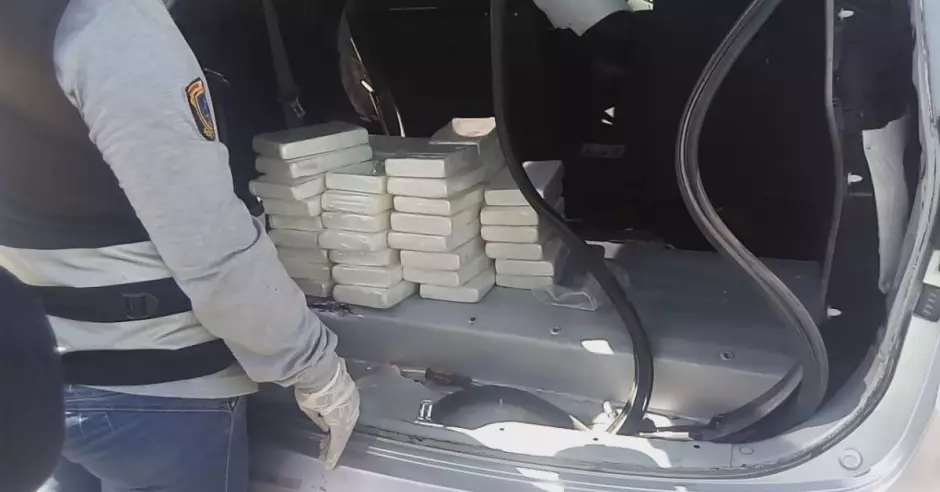 Efectivos de Carreteras y Antidrogas de la Policía Nacional intervinieron a un vehículo de placa D7G-352 que guardaba 51 kilos de droga ocultos en un compartimiento en la parte de la maletera.