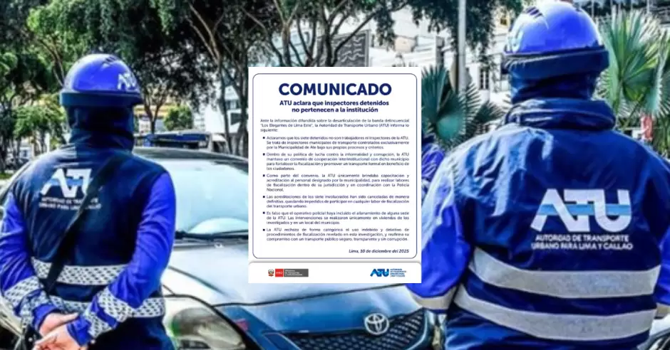 "Aclaramos que los siete detenidos no son trabajadores ni inspectores de la ATU. Se trata de inspectores municipales de transporte contratados exclusivamente por la Municipalidad de Ate bajo sus propios procesos y criterios", indica el documento.