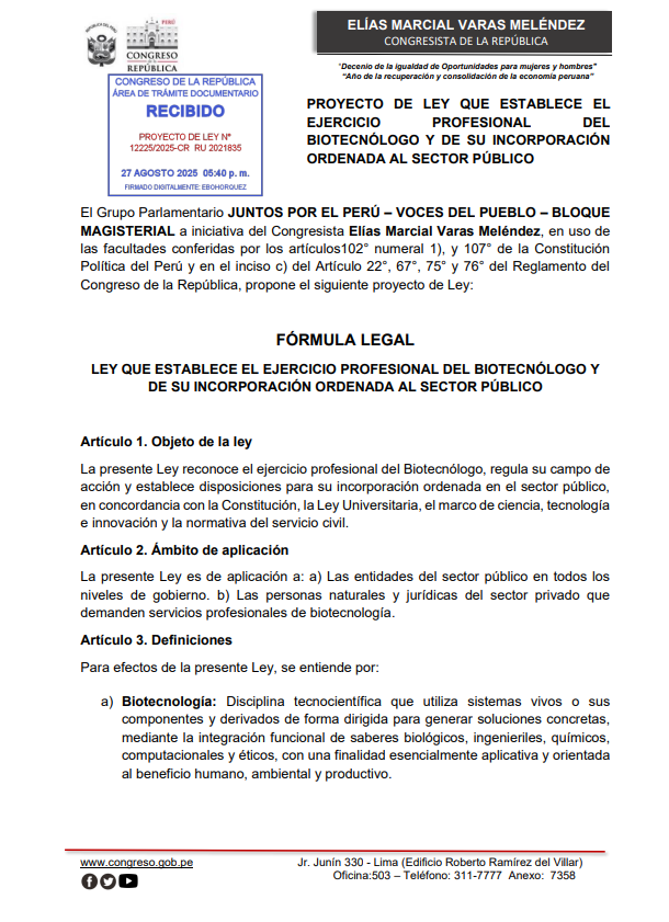 El Grupo Parlamentario Juntos por el Perú, Voces del Pueblo, Bloque Magisterial ha propuesto un proyecto de ley que reconocería el ejercicio profesional del Biotecnólogo en el sector público. Esta propuesta ofrecería una ventana al desarrollo científico en el país.