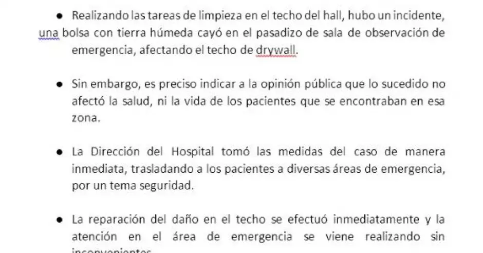 Recordemos que en el Hospital de Emergencias de Grau se cayó un pedazo de techo sobre una paciente que se encontraba postrada en una cama del nosocomio. Afortunadamente, no pasó a mayores.