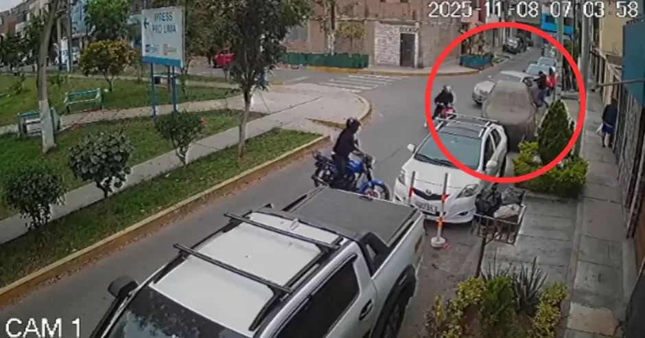 En imágenes se observa un vehículo de color dorado llegar hasta un parque, en Los Olivos, y es en un espacio vacío, en el frontis de una casa, que intenta estacionarse. Habiendo pasado tan solo segundos, llegaron tres sujetos a bordo de dos motocicletas, uno de estos llevaba una mochila de delivery. Es este último quien desciende para acercarse hasta la unidad.