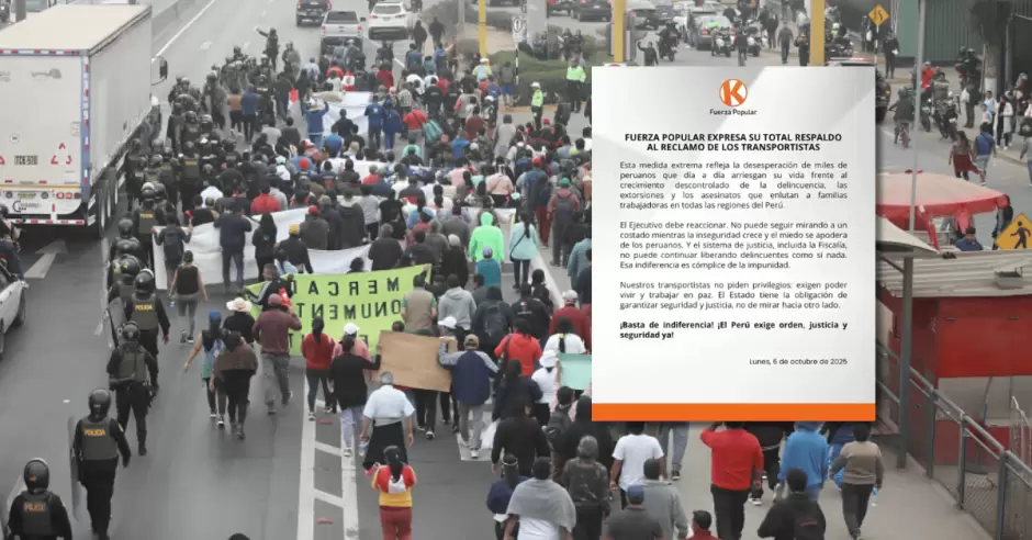 La tarde de este lunes 6 de octubre, a través de su red social 'X' (antes Twitter), el partido político Fuerza Popular emitió un comunicado público en el que se manifestó sobre el paro de transportisas que se viene desarrollando hoy.