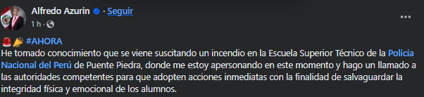 En medio de este siniestro, a través de sus redes sociales, el congresista y policía retirado, Alfredo Azurín, no fue ajeno a la situación y exhortó a las autoridades competentes a que tomen las acciones inmediatas con la finalidad de salvaguardar la integridad física y emocional de los alumnos de la escuela de la PNP en Puente Piedra.