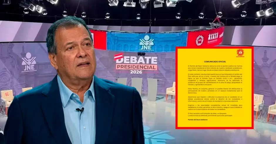 El candidato por Buen Gobierno, Jorge Nieto no llegó a tiempo a la última jornada del debate presidencial, luego de que el auto donde se venía trasladando iba sufriendo demoras. Sin embargo, su partido reporta problemas en el tránsito, congestión vehicular y presencia de manifestantes que habrían complicado su traslado.