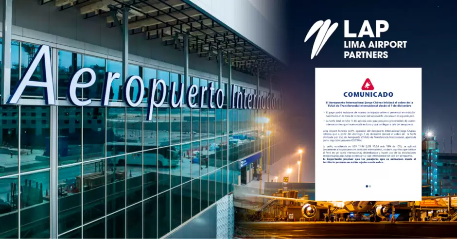 Según el comunicado de LAP, la tarifa total asciende a USS 11.86 (USS 10,05 más 18% de IGV) y se aplicaría únicamente a los pasajeros en conexión internacional.