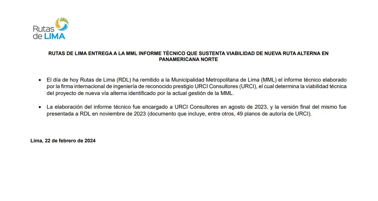 "El día de hoy, Rutas de Lima (RDL) ha remitido a la Municipalidad Metropolitana de Lima (MML) el informe técnico elaborado por la firma internacional de ingeniería de reconocido prestigio URCI Consultores (URCI), el cual determina la viabilidad técnica del proyecto de nueva vía alterna identificado por la actual gestión de la MML", se lee en el texto.