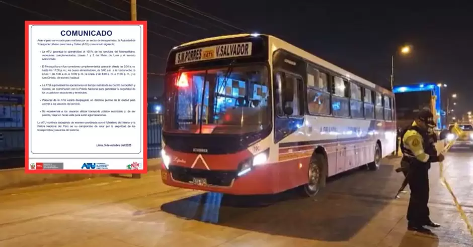 A raíz del paro de transportes convocado para este lunes 6 de octubre, en solidaridad con el nuevo asesinato de un conductor de un bus de la empresa Lipetsa, la Autoridad de Transporte Urbano en Lima y Callao garantizó el transporte a través del Metropolitano, corredores complementarios y el Metro de Lima.