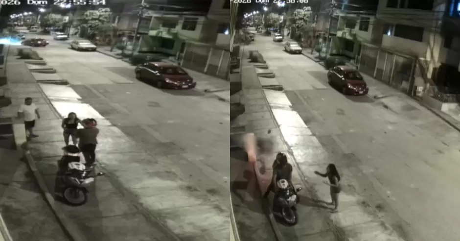 Cámaras de seguridad grabaron lo ocurrido en el jirón Río Blanco, donde según información preliminar la pareja protagonizaba una fuerte discusión en plena vía pública entre una mujer, que vestía short y polo negro, y un hombre que llevaba un casco y acababa de llegar con su motocicleta al lugar.