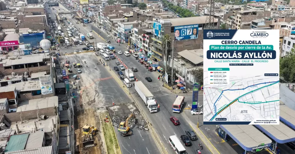 La Municipalidad de Ate iniciará obras en un tramo de la concurrida avenida Nicolás Ayllón, cuyo tramo desde la calle Santa María hasta la calle El Progreso permanecerá clausurada por un plazo de 8 meses para realizar obras en el cerro Candela.