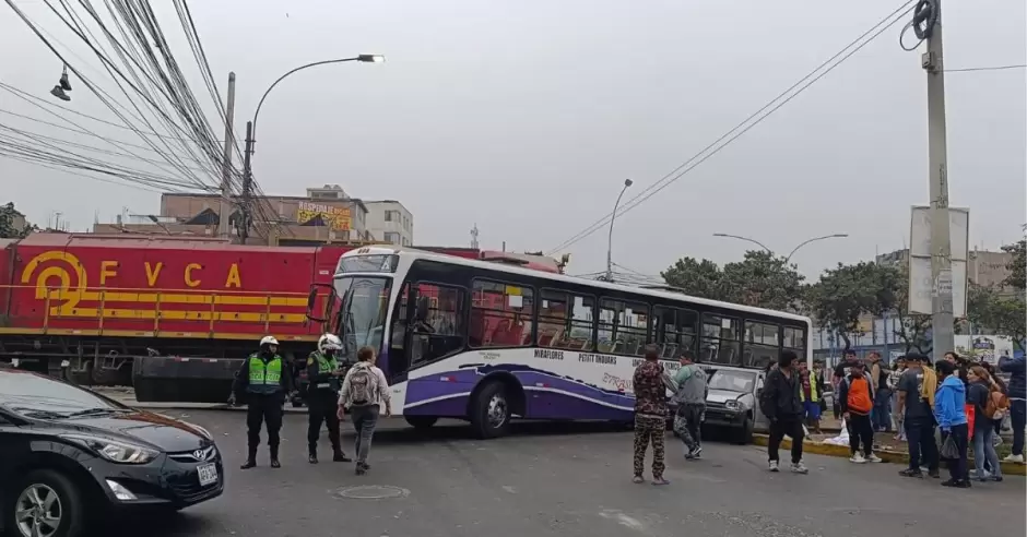 Un accidente entre un tren de carga, un bus de transporte público y un auto pequeño se registró en el cruce de las avenidas Ferrocarril y José Carlos Mariátegui en el distrito de El Agustino.