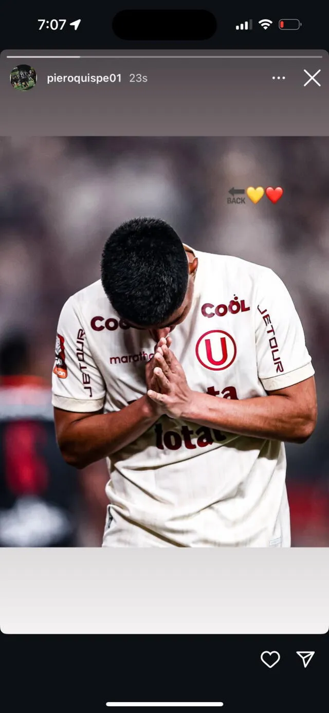 La publicación duró poco, pero fue suficiente. En su cuenta de Instagram, Piero Quispe compartió una foto suya en pleno partido con Universitario de Deportes, correspondiente al 2023.