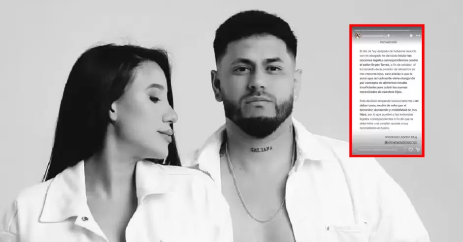 "El día de hoy después de haberme reunido con mi abogado he decidido iniciar las acciones legales correspondientes contra el señor Bryan Torres, a fin de solicitar el incremento de la pensión de alimentos de mis menores hijos, esto debido a que la suma que actualmente viene otorgando por concepto de alimentos resulta insuficiente para cubrir las nuevas necesidades de nuestros hijos", se lee en el comunicado publicado en su cuenta de Instagram.