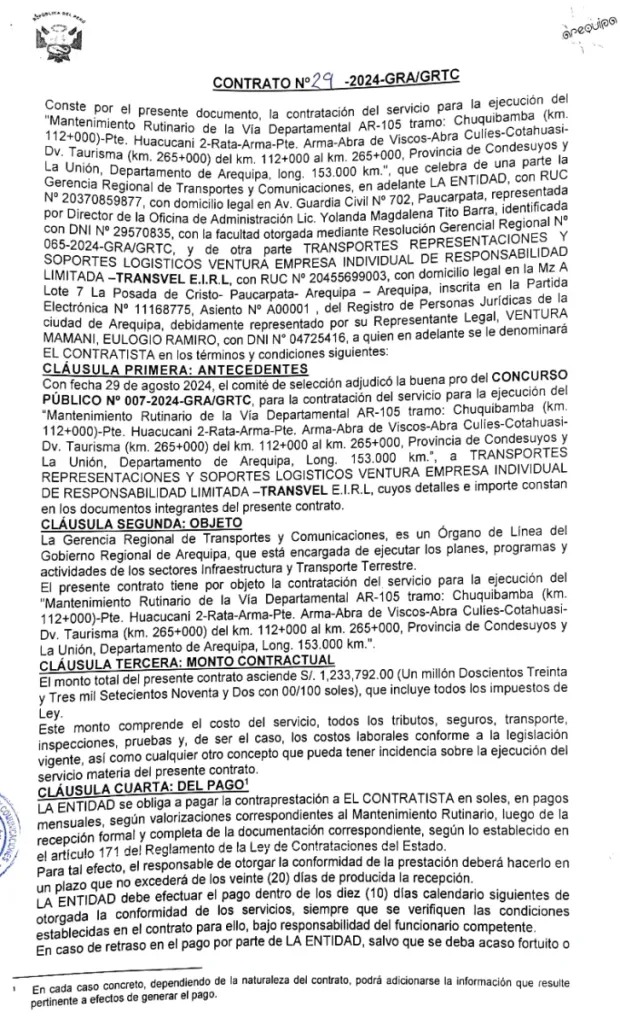 De acuerdo al contrato firmado por la Gerencia Regional de Transportes y Comunicaciones (GRTC), que en aquel entonces dirigía el actual gerente general del Gobierno Regional de Arequipa Johan Ariano Cano Pinto, y la empresa en cuestión, el mantenimiento debió realizarse desde el kilómetro 112 de la vía AR-105; en el distrito de Chuquibamba (Condesuyos), hasta el kilómetro 265; en el pueblo de Taurisma, atravesando el distrito de Cotahuasi.