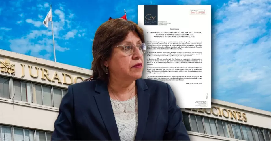 La magistrada Delia Espinoza, decana del Ilustre Colegio de Abogados de Lima (CAL), recurrió a la justicia constitucional para denunciar que el Jurado Nacional de Elecciones vulneró sus derechos fundamentales. Según el documento, se le impidió sufragar el 12 de abril por una exclusión arbitraria del padrón electoral.