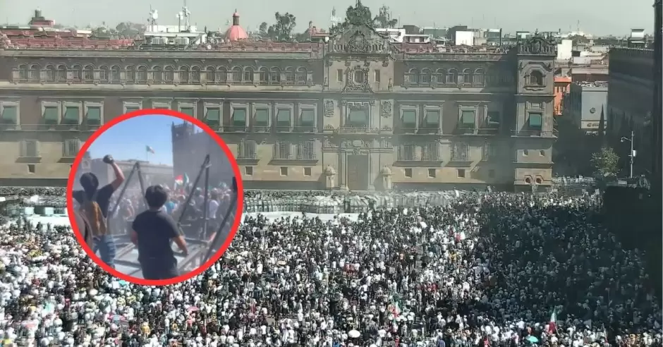 Algunos manifestantes golpearon estas paredes, sumado a ello, se comenzaron a lanzar objetos, lo que provocó que la policía inicie acciones de dispersión lanzando gases lacrimógenos. Fue alrededor de las 14:30 (hora México) que los ciudadanos lograron derribar la valla metálica frente a Palacio Nacional, por lo que solo la protegía un gran contingente policial.