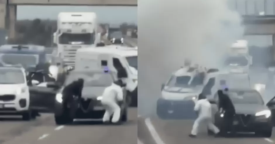 Para asegurar el éxito del golpe y bloquear cualquier intento de persecución, la banda utlizó una emboscada milimétrica tras incendiar varios vehículos en ambos sentidos de la autopista y lanzaron cientos de clavos sobre el asfalto. Esta secuencia fue filmada por un testigo y ya viene haciéndose viral en redes sociales como X (antes Twitter), Facebook e Instagram.