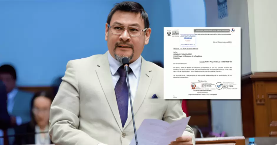 Ahora, el últio domingo 19 de octubre, la agrupación política APP ha retirado dicha iniciativa legislativa N°12793/2025-CR. El documento que generó de inmediato una ola de críticas y un masivo rechazo, por sectores políticos y especialistas tributarios, fue retirado a través de un oficio dirigido al Oficial Mayor del Congreso, Giovanni Forno.