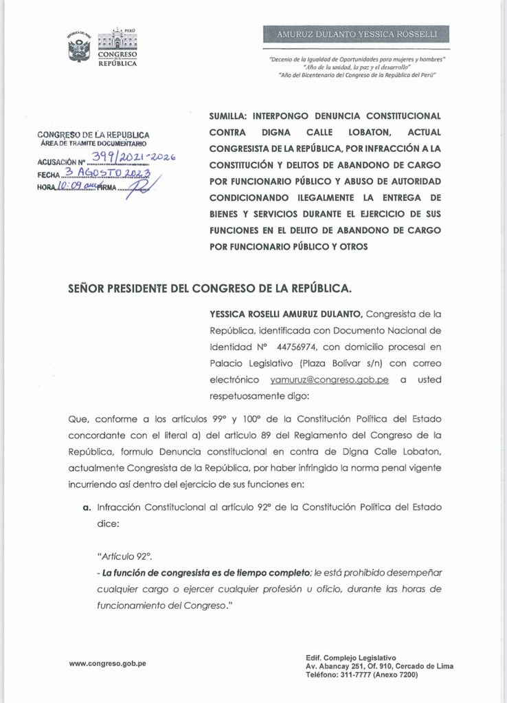 "Los hechos objeto de la presente denuncia constitucional se agravan, en tanto la denuncia siendo congresista de la República, sin ejercer sus principales funciones legislativas, de representación y fiscalizadoras, tiene un personal a su cargo en su despacho, con presupuesto del Estado, lo cual constituye un perjuicio económico", se lee en parte del documento.