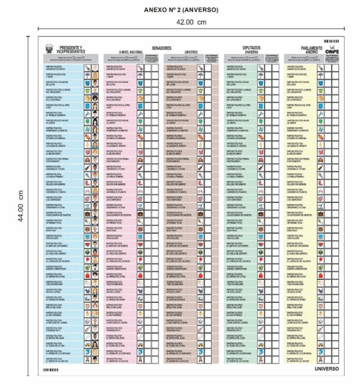 El documento se dividirá en cinco columnas claramente diferenciadas, correspondientes a: Presidentes y vicepresidentes, Senadores a nivel nacional, Senadores a nivel regional, Diputados, Parlamento Andino.