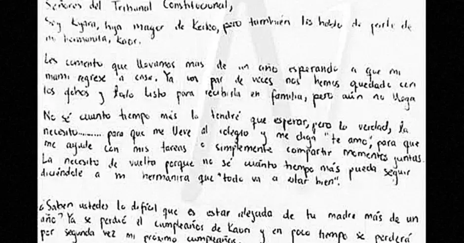 En la misiva, la hija mayor de Keiko apela a la falta que le hace su mamá en el hogar y cuenta que espera su retorno. “¿Saben ustedes lo difícil que es estar alejada de tu madre más de un año? Ya se perdió el cumpleaños (de mi hermana) y en poco tiempo se perderá mi próximo cumpleaños”, escribió la menor.