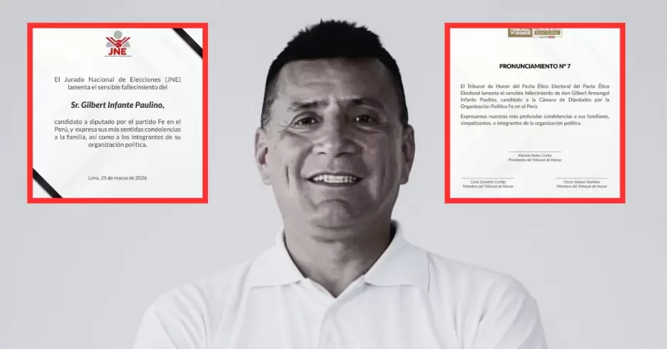 "El Jurado Nacional de Elecciones lamenta el sensible fallecimiento del Sr. Gilbert Infante Paulino, candidato a diputado por el partido Fe en el Perú, y expresa sus más sentidas condolencias a la familia, así como a los integrantes de su organización política", informaron.