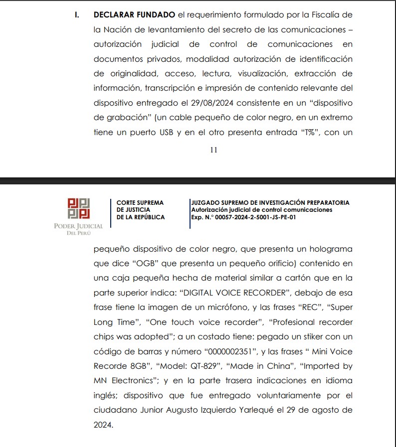 En esa línea, se comprobará la originalidad del contenido que contenga el dispositivo entregado por el capitán de la Policía. Asimismo, se efectuará su "lectura, visualización, extracción de información, transcripción e impresión de contenido relevante", como parte de la persecución eficaz del delito, el cual sería contra la administración pública.
