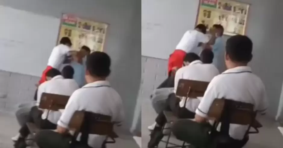 En las imágenes se observa al docente arrinconado en una esquina del aula mientras intenta protegerse con los brazos, sin responder con agresiones físicas ni verbales. El menor se le abalanza repetidamente e intenta golpearlo con un lapicero, generando una escena de tensión evidente entre los compañeros.