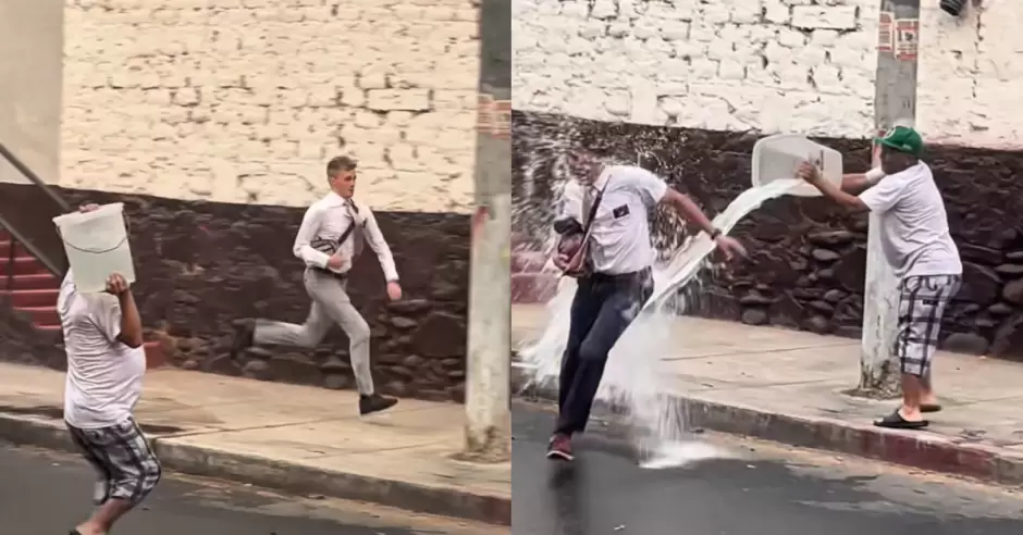 El que iba delante logra escapar de un vecino que tenía un balde de agua sobre los hombros, pero su acompañante no tuvo la misma suerte y el vecino terminó echándole todo el balde de agua, sin importar que estaba vestido con traje y llevaba sus pertenencias en una mochila.