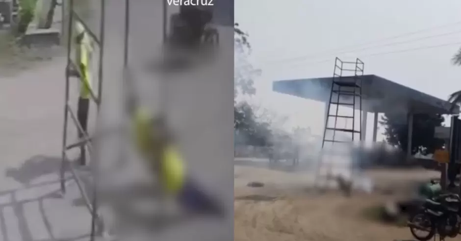 Las cámaras de vigilancia captaron el preciso instante en que tres albañiles movían un andamio metálico de gran altura. Repentinamente, dos de ellos se quedaron pegados a las barras metálicas, mientras que el tercero logró soltar el andamio y así salvó su vida.